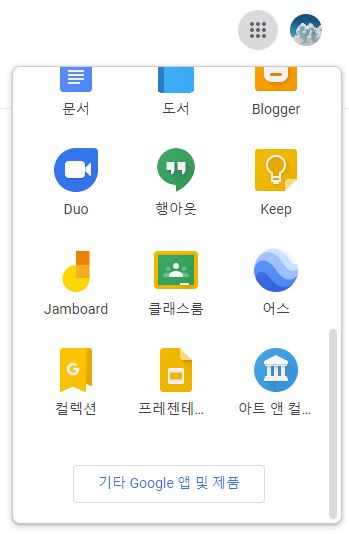 구글 로그인 후 오른쪽 상단에서 메뉴를 눌러 맨 아래에 가면 기타 Google 앱 및 제품 클릭