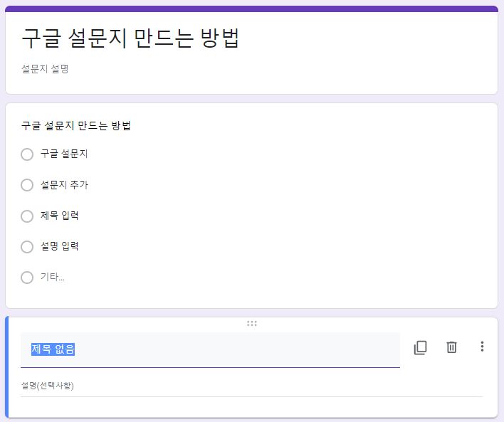 설문을 따로 추가하는 것이 아니라 제목 및 설명을 추가하는 부분입니다.