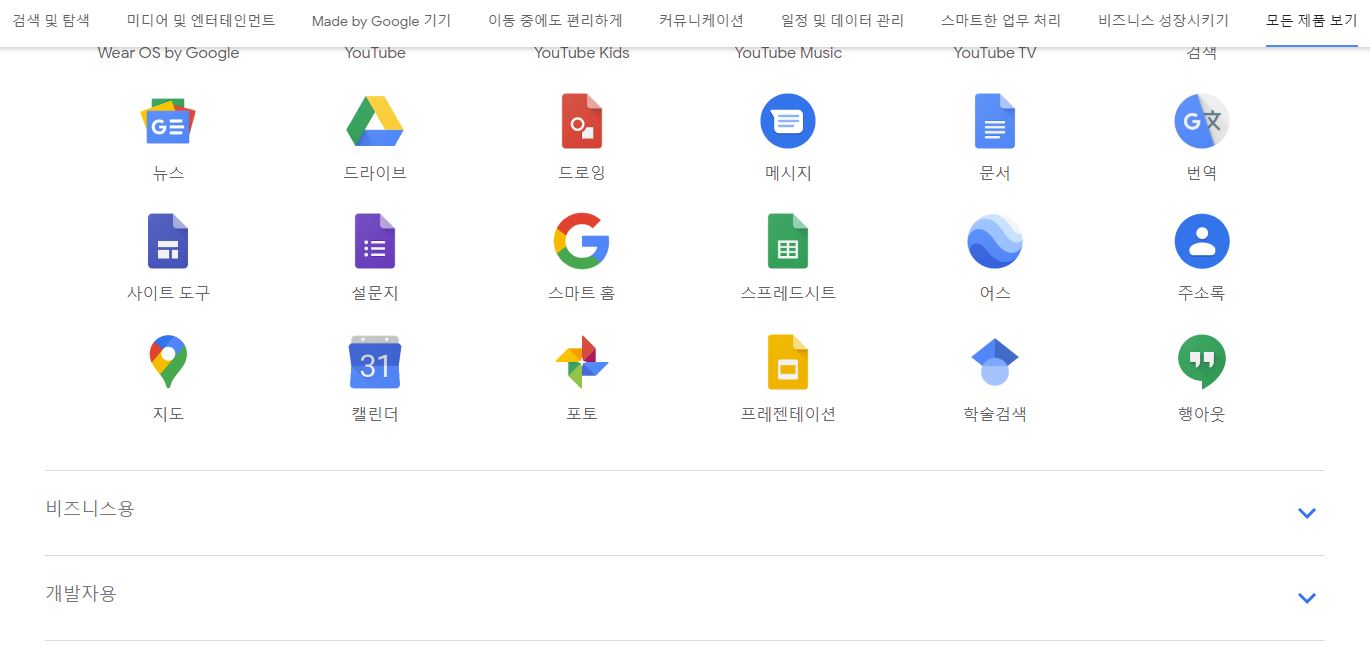 구글 제품들을 볼 수 있는 사이트에 들어갈 수 있습니다.