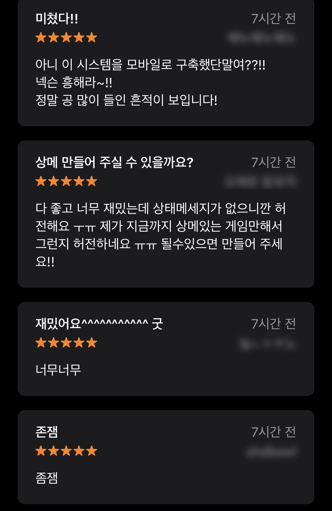 모바일 게임의 특성상 처음에는 부족한 부분이 있기 마련이죠. 점점 더 좋아지는 모습이 보이길 기대해봅니다.