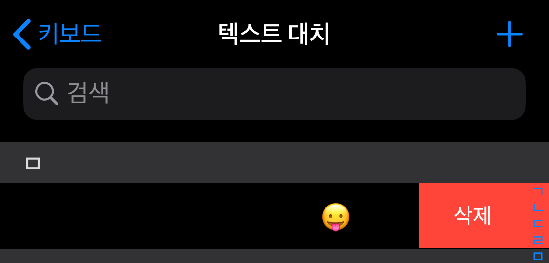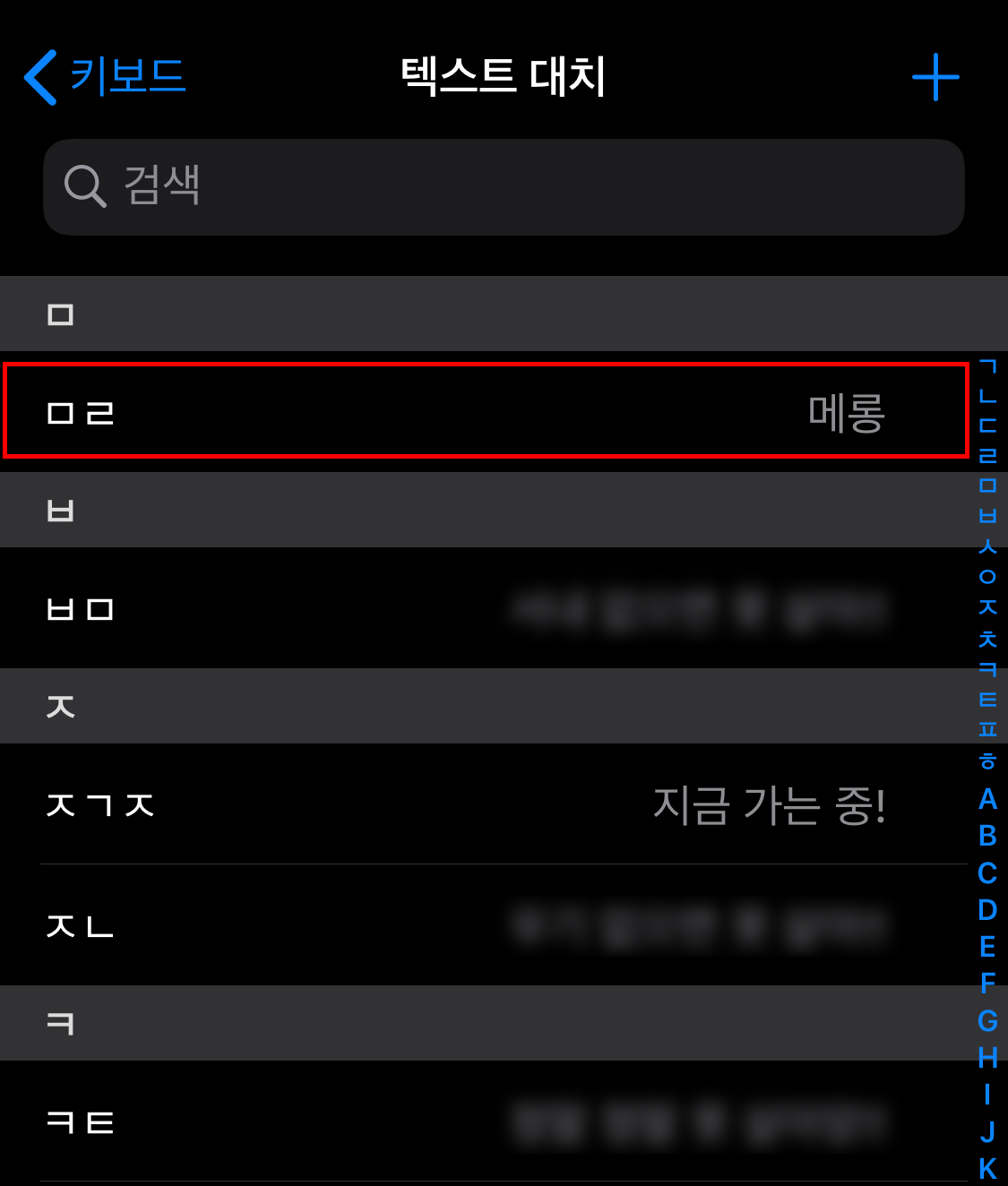이것은 아이폰 텍스트 대치라는 것을 이용한 아이폰 단축키입니다. 처음에 아무것도 건드리지 않았다면 ㅈㄱㅈ 이것 하나만 있을 거예요. 하지만 설정을 통해 바꾸거나 추가할 수 있습니다.