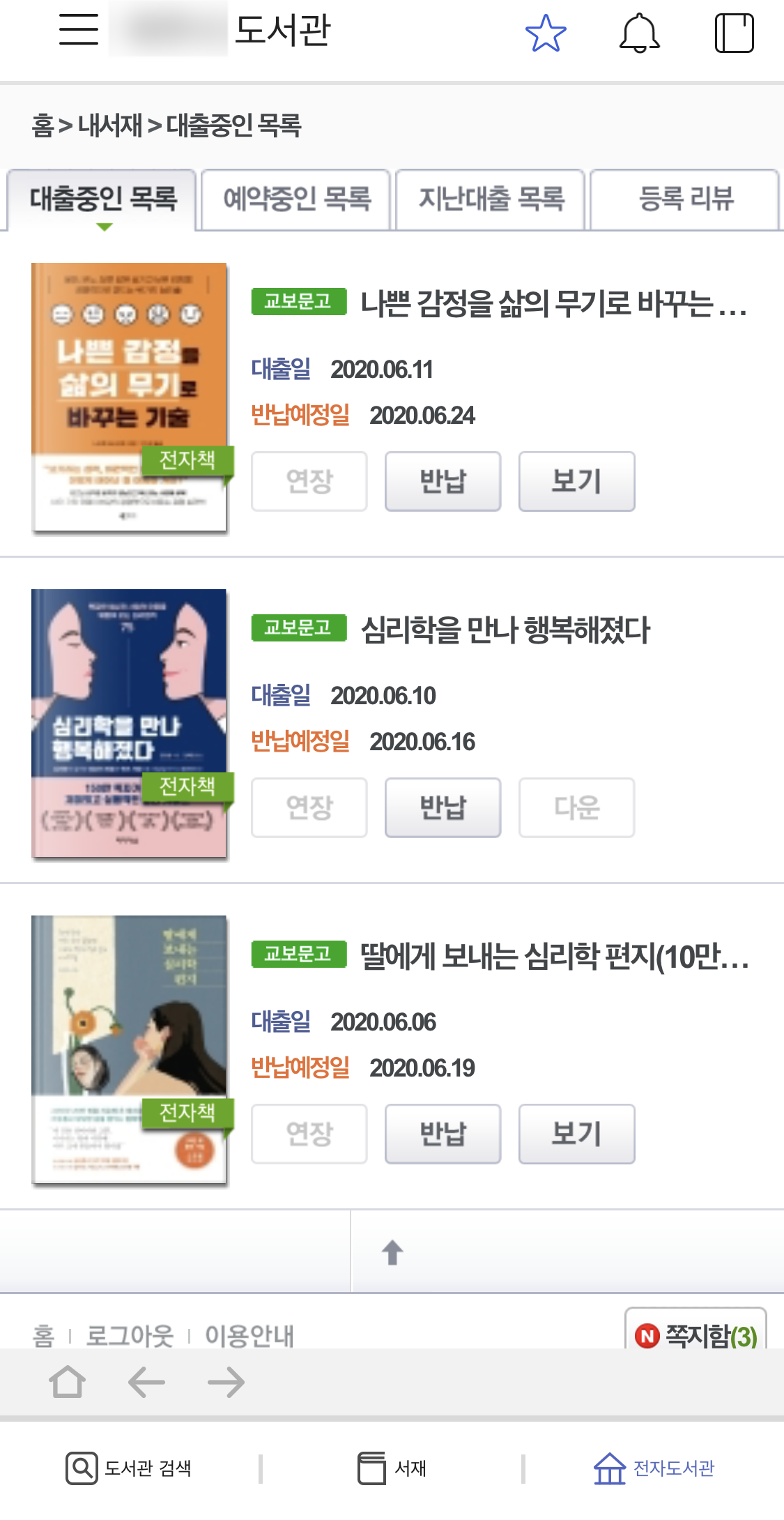 저는 현재 3권의 책을 빌린 상태입니다. 가운데 책은 보지도 못했는데 반납을 해야 하네요 ㅠㅠ 전자도서관이 안 좋은 점 중 하나는 나도 모르게 예약된 책이 빌려져 있다는 것입니다. 그렇기 때문에 확인을 안 하면 대출이 된 줄도 몰라요. 기간도 짧아서 연장을 해주어야 하는 게 그것도 못한 상태로 책을 보내주었습니다.