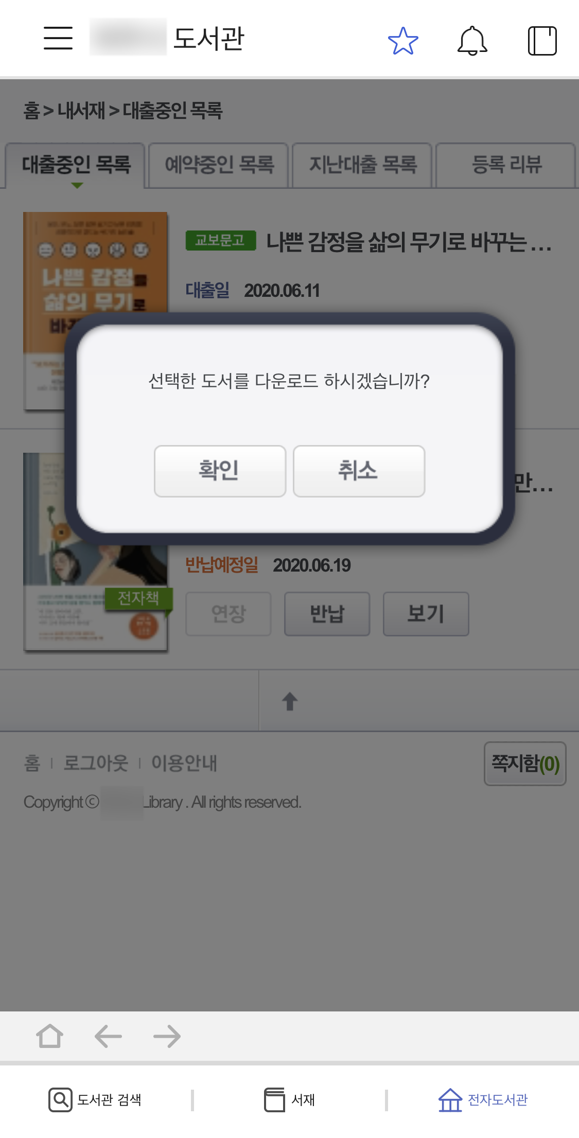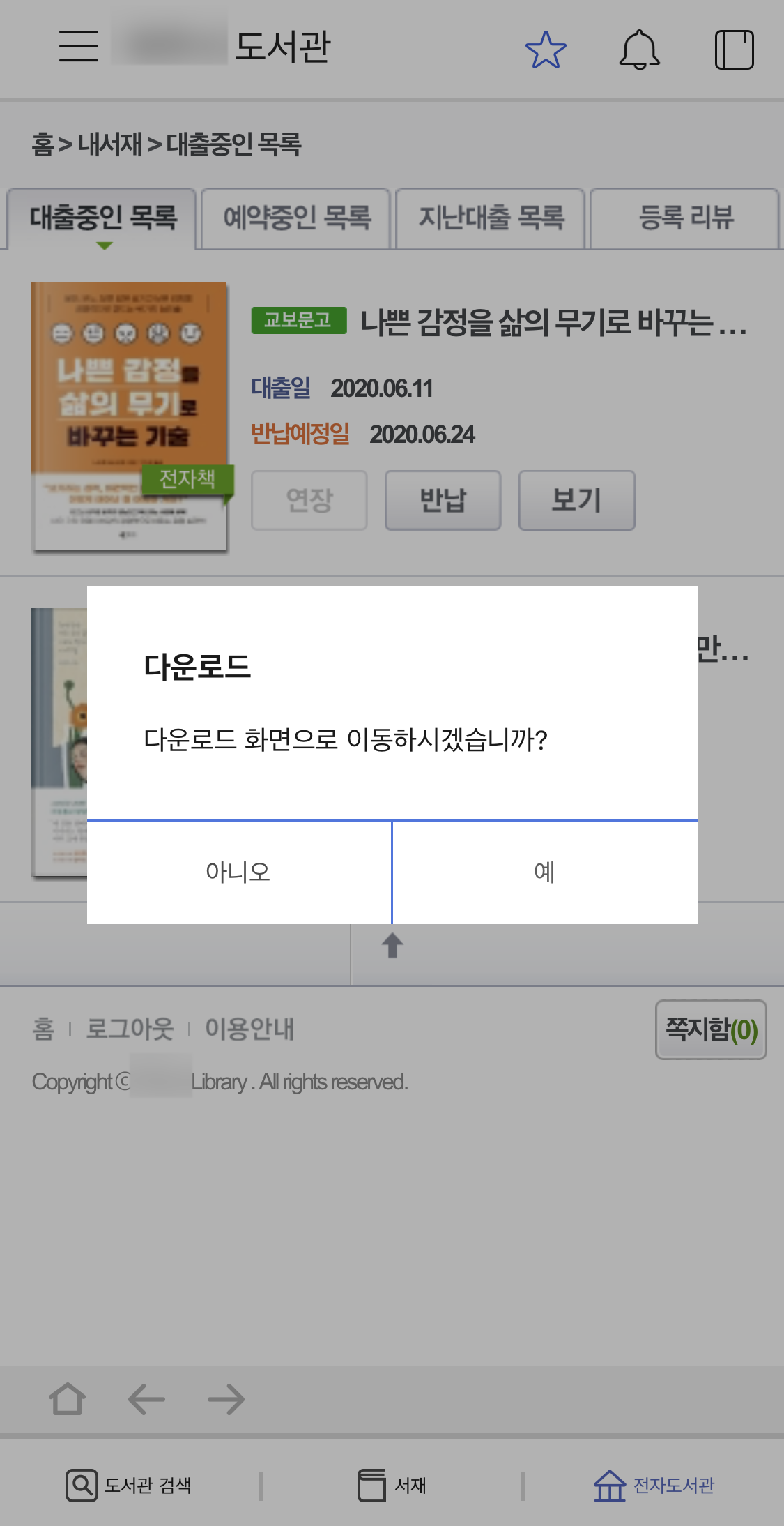 대출한 책을 보기 위해서 보기를 누르면 다운로드를 하라고 합니다. 여기서 예를 눌러주세요.
