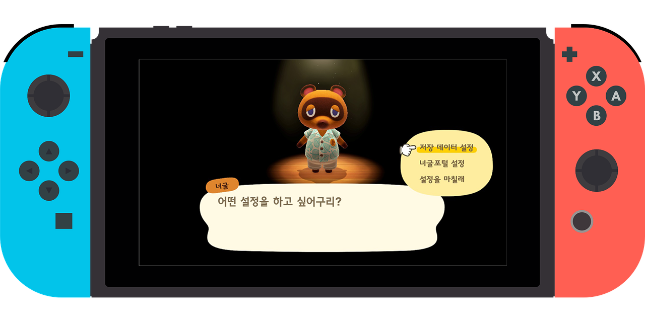 5. 너굴이가 나오는데 '저장 데이터 설정'을 눌러주세요.
