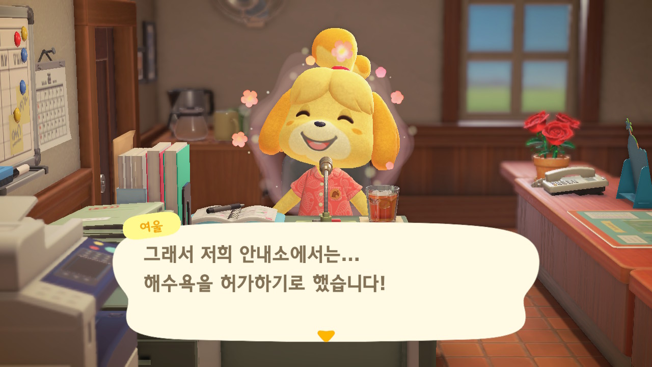 처음 접속하니 여울이가 공지사항이 있다면서 해수욕을 허가한다는 말을 합니다. 혼자 말하면서 신나있네요.