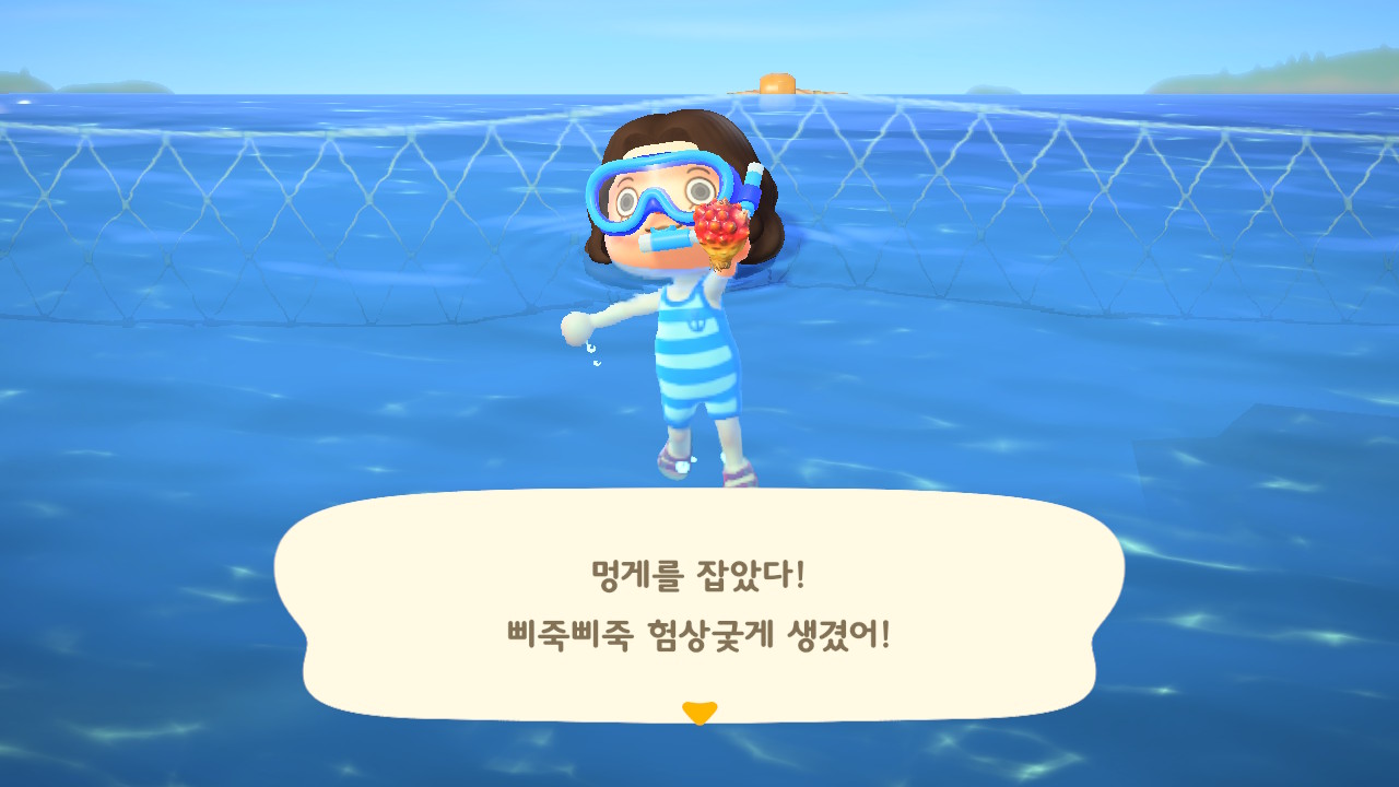 이건 해산물을 잡는 장면입니다. 동물의숲 해산물 잡는 방법은 매우 간답합니다. 해산물 기포를 찾아 가서 잠수를 하고 잠수를 한 뒤 그림자를 찾아 근처로 이동하면 돼요. 아니면 그림자 근처에서 잠수를 해도 됩니다. 처음엔 그림자가 잘 안보이는데 하다보면 그림자가 보입니다.