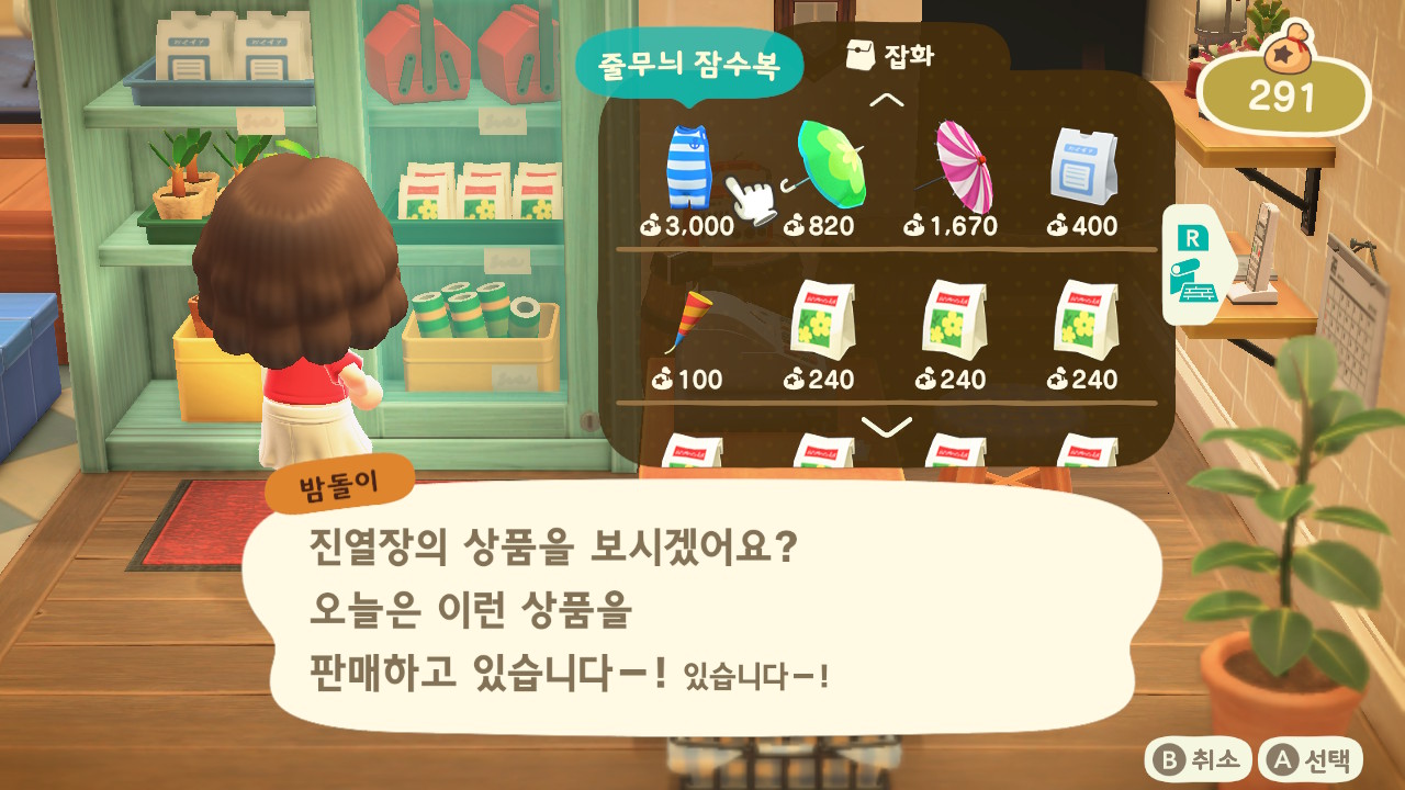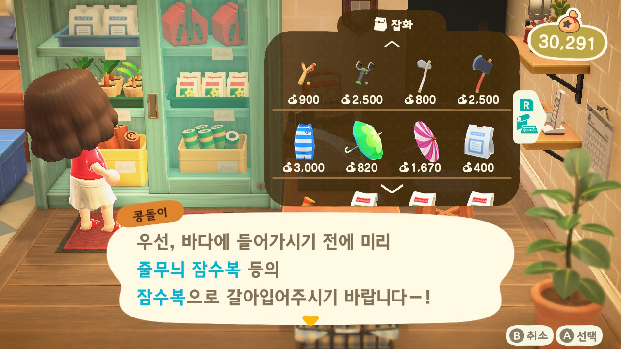 바로 입수는 되지 않고 잠수복을 입어야 합니다. 잠수복은 너굴상점에서 살 수 있는데 현재는 줄무늬 잠수복 하나만 나와있습니다. 이따가 아래에서 볼 수 있습니다!