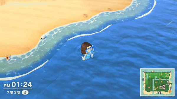 동물의숲 수영 잠수 해산물 잡는 방법