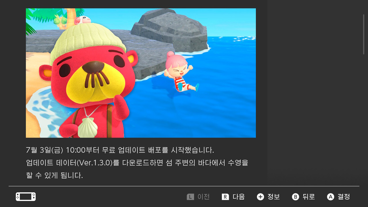 드디어 동물의숲에 수영 잠수가 업데이트 되었습니다. 7월에 업데이트 된다고 예고했었는데 벌써 일주일이 지나서 업데이트가 되었습니다.
