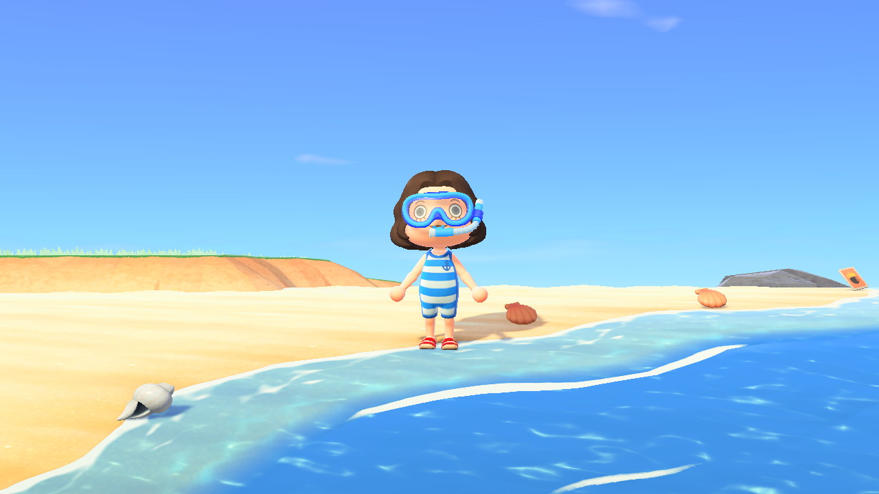 이 모습이 닌텐도한테 받은 스노쿨링 안경과 너굴 상점에서 산 파란색 줄무늬 수영복입니다. ㅋㅋㅋㅋㅋㅋ 이제보니 신발이 포인트아닌 포인트가 되었네요. 얼른 수영하고 싶은 마음에 신발은 신경을 하나도 못썼어요.
