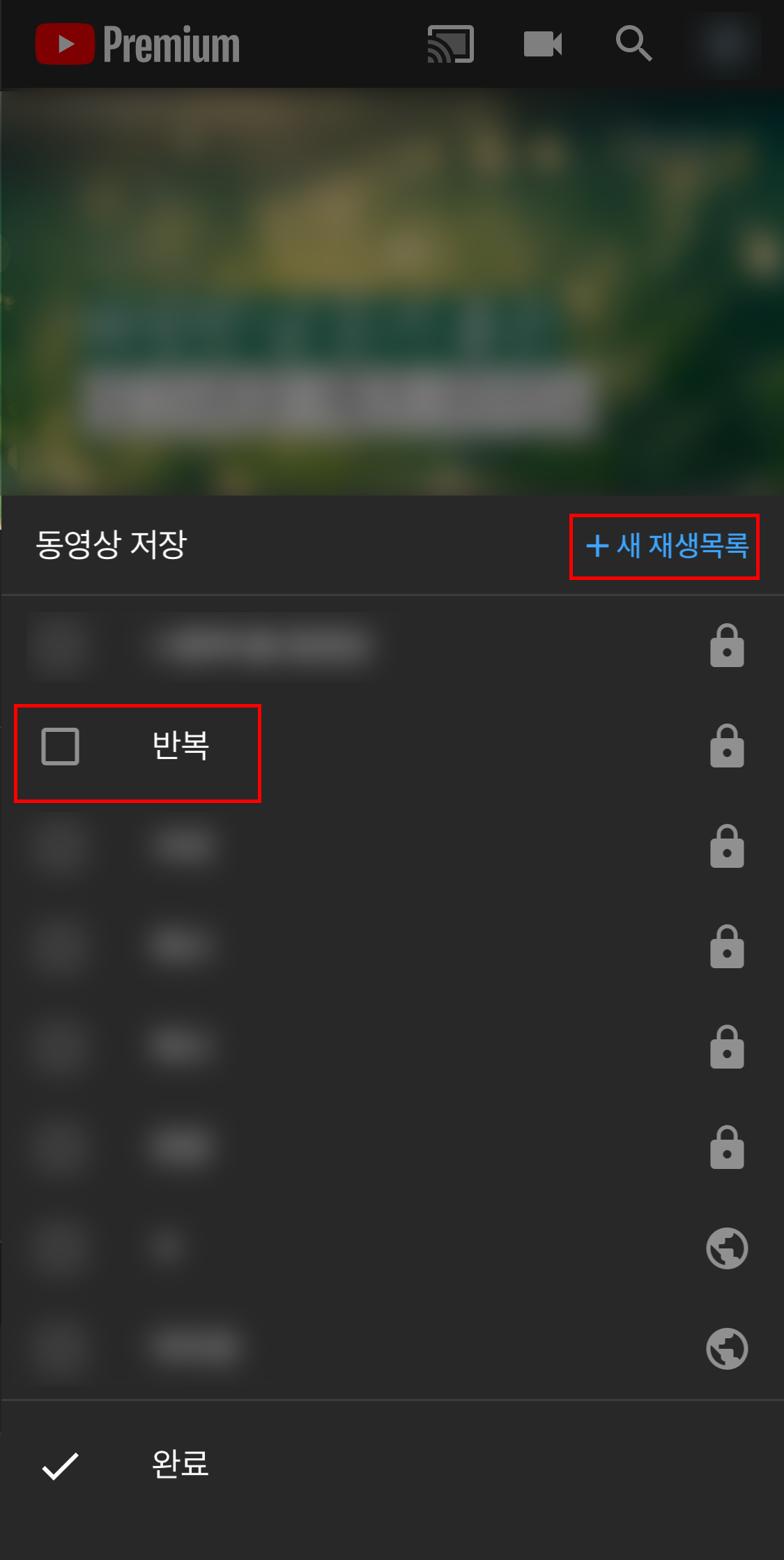없을 경우엔 [+새 재생목록]을 눌러서 반복이라는 목록을 만들어주세요.