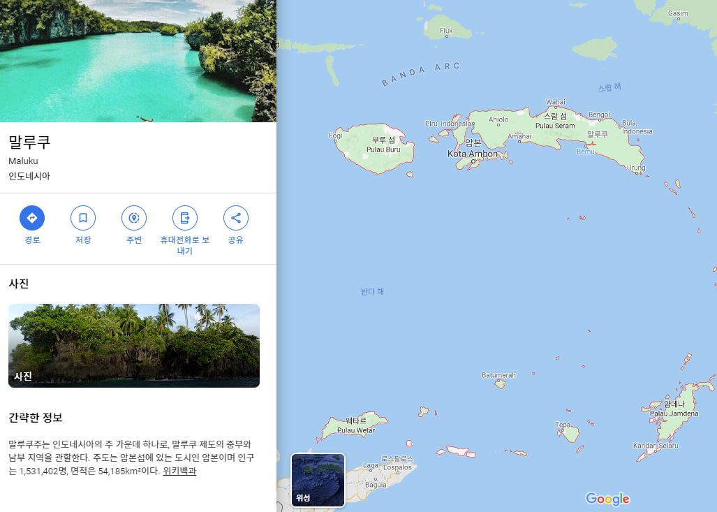 참고로 여기가 말루쿠입니다. 말루쿠해는 어딘지 모르겠지만 말루쿠섬은 여기에요. 네이버에는 말루쿠를 쳐도 지도에 나오지 않더라고요. 다음은 백과사전만 나오는 정도고요. 구글에 검색을 하면 조금 더 자세히 볼 수 있습니다. 국제적인 것은 역시 구글인 것 같네요.