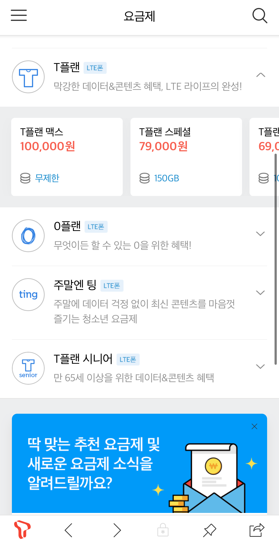 제가 바꿀 [T플랜]을 누르면 아래에 메뉴가 나타납니다. 손가락으로 옆으로 밀면 요금제가 더 나옵니다.