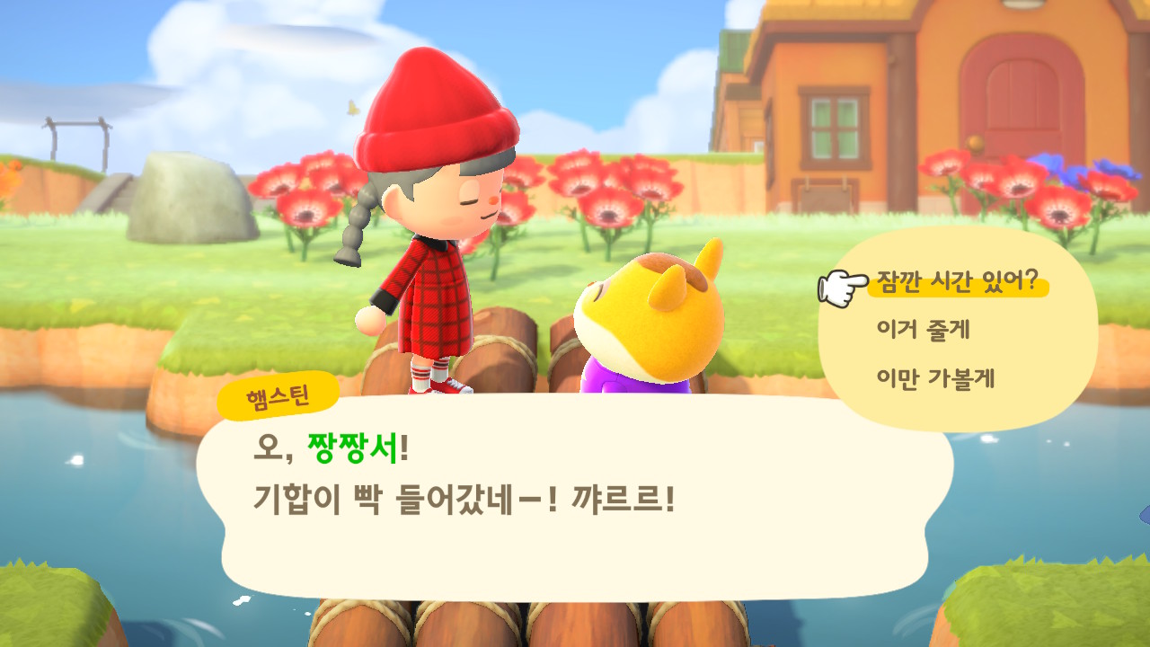 친밀도가 조금 쌓이면 '이거 받아' 선택지가 생기면서 주민에게 선물을 줄 수 있는 단계가 2단계입니다.