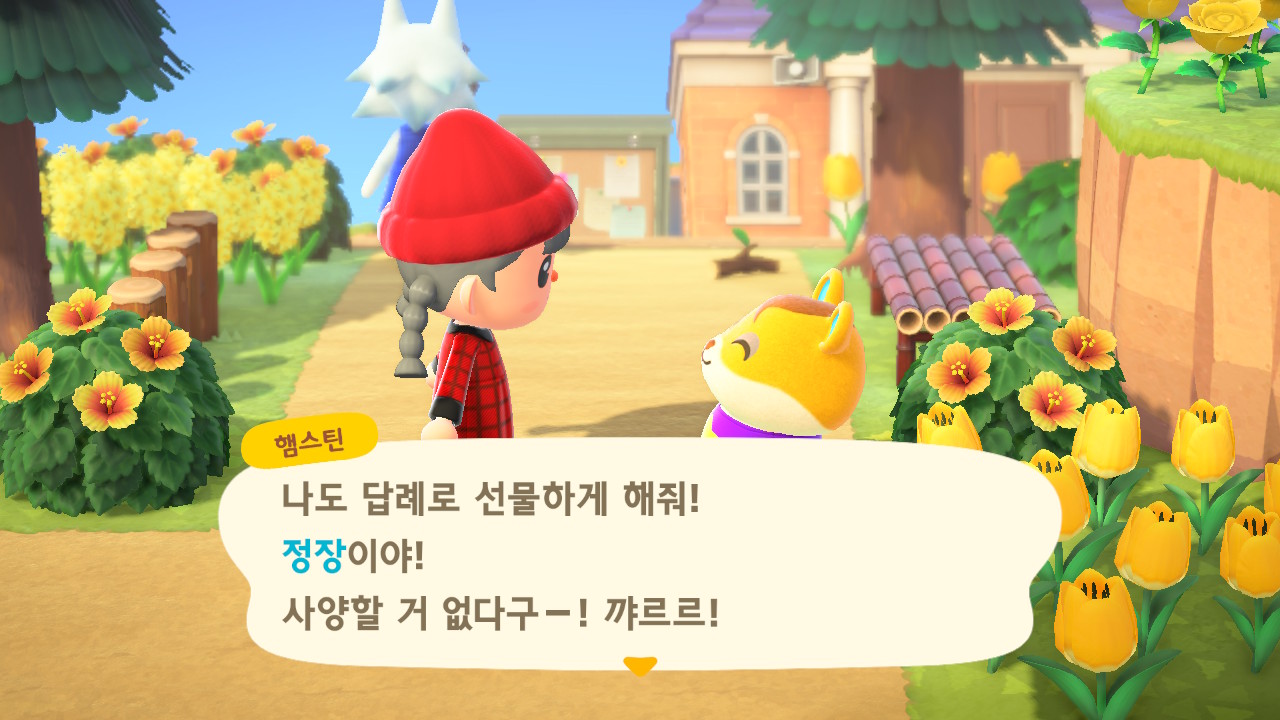 4단계는 말버릇을 바꿀 수 있습니다. 저의 첫 주민이자 애착 주민이 된 햄스틴의 원래 말버릇은 '햄햄'이었습니다. 말버릇 고민하더니 바꿔달라고 해서 '꺄르르'로 바꿔주었어요. 햄스틴 외에는 아직 말버릇이 바뀌거나 바꿔달라고 한 주민은 없었습니다. 가장 오래돼서 그런가 친밀도가 가장 높은 것 같더라고요.