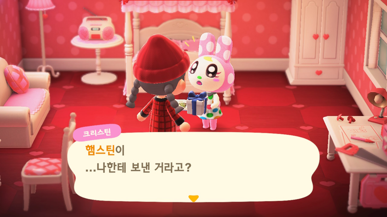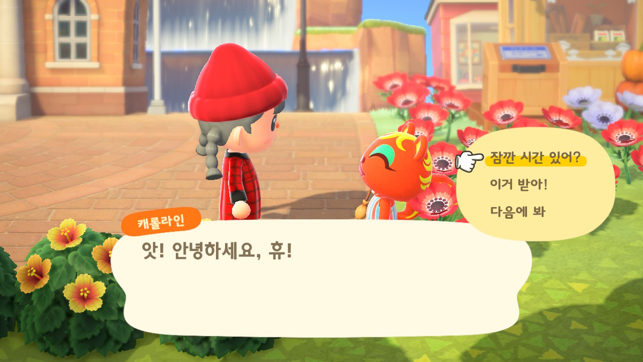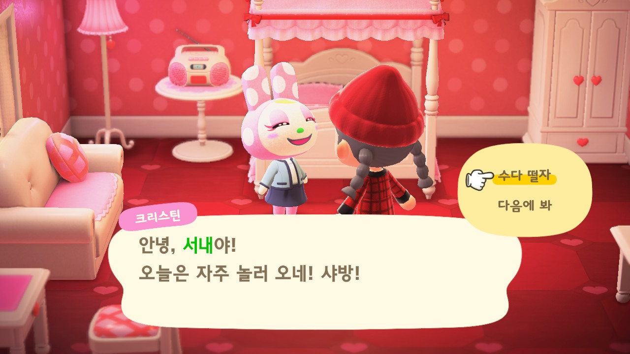 제 섬에 온지 얼마 안 된 크리스틴에게 대화를 걸어보았습니다. 이 상태가 1단계입니다. 말을 걸었을 때 '이거 받아'라는 선물 주는 선택지가 없습니다.