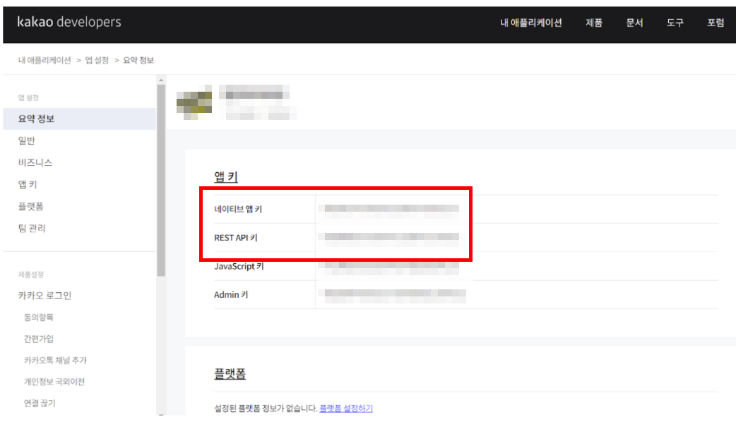 그럼 이러한 화면이 뜨는데, 여기서 우리가 필요한 '네이티브 앱 키'와 'REST API 키'를 확인할 수 있습니다. 이것들을 복사해서 아임웹 소셜 로그인 중 카카오 로그인 각 부분에 붙여 넣기 해주세요.