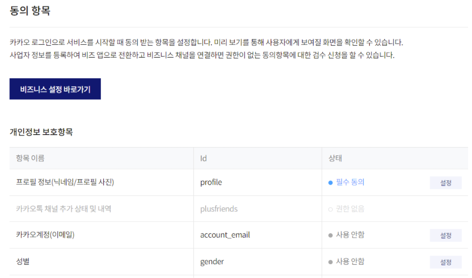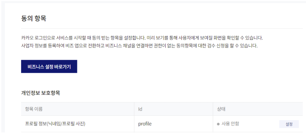 순서대로 쭉 진행을 하면 되는데요. [개인정보 보호 항목]에서 프로필 정보 맨 오른쪽에 [설정] 버튼을 눌러주세요.