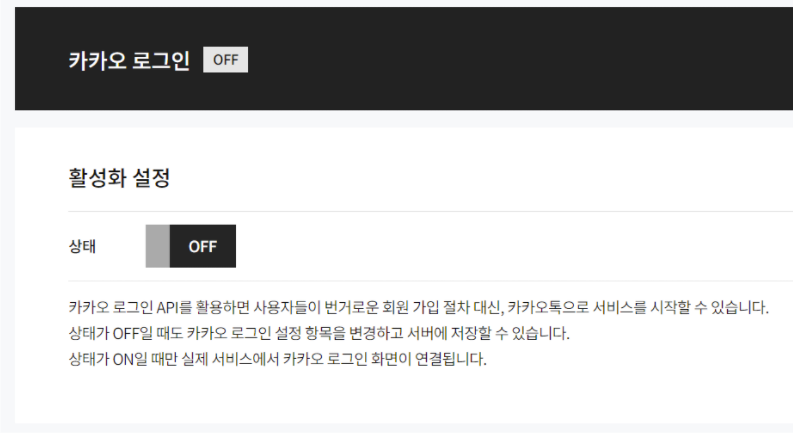 아마 활성화 설정 상태가 OFF일 텐데 이걸 클릭해서 카카오 로그인을 활성화할 거냐는 말에 저장을 누르시고 ON으로 바꿔주세요.
