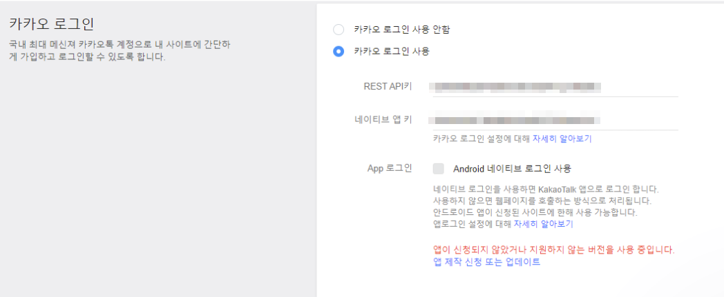 아까 입력을 했겠지만, 안하셨다면 입력해주시면 됩니다. 그리고 [카카오 로그인 사용] 체크하고 저장하는 것 잊지 마세요.