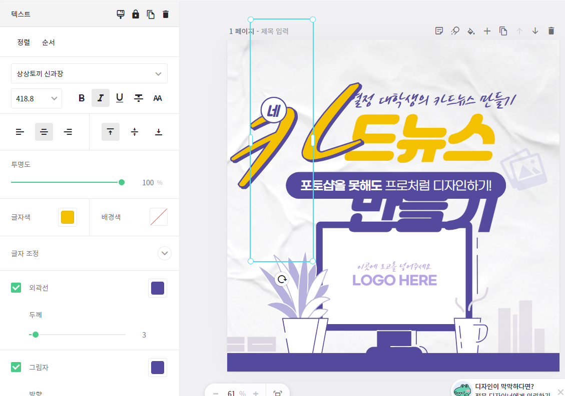 글자를 클릭하면 글자 크기를 줄이거나, 외곽선, 글자색, 투명도 등을 수정할 수 있는 화면이 왼쪽에 나옵니다. 여기서 글자들을 누르면서 크기를 조금씩 줄여보겠습니다.