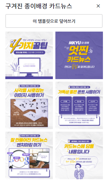 선택하면 이렇게 나와요. 여기서 하나만 선택해서 사용할 수 있고, 위에 '이 템플릿으로 덮어쓰기' 하면 모든 템플릿들이 내 캔버스(하얀 화면)에 덮어씌워집니다.