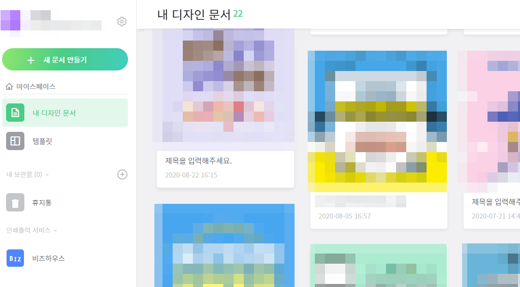 만든 게 워낙 많아서... 다 모자이크 처리를 하긴 했지만, 저는 만든 후 따로 저장은 안 했는데 이렇게 내 문서에 자동으로 저장이 됩니다. 예전에 만들었던 것을 확인해볼 수 있어요.