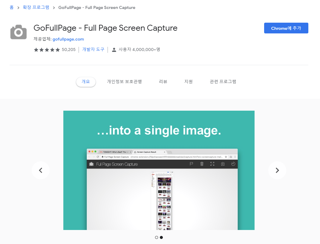 gofullpage를 설치하고 난 화면을 캡쳐한 것인데 해당 프로그램을 사용하면 캡쳐 후 캡쳐된 모습을 이렇게 보여줍니다.