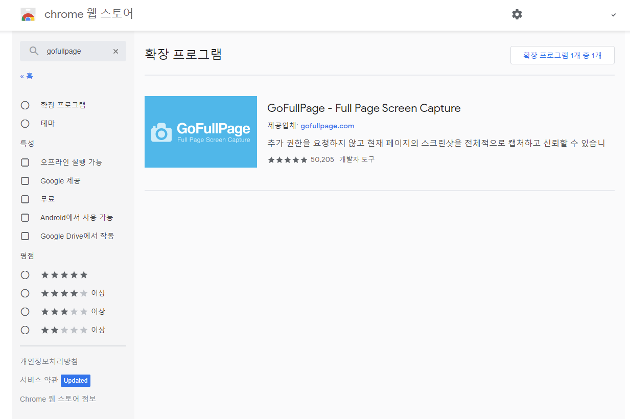 우선 크롬을 써야합니다. 크롬이 없다면 다운을 받으시면 되고, 크롬에서 앱스토어라는 곳이 있어요. 크롬 앱스토어에 들어간 다음 검색 창에 'gofullpage'라고 검색을 하지면 돼요.
