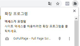 '액세스가 요청됨' 그리고 아래애 우리가 깔았던 gofullpage 가 나올텐데 영어 이름 옆에 고정하는 핀 모양의 아이콘이 있는데 이걸 눌러줍니다. 그럼 하얀색 배경에 회색 테두리였던 아이콘이 모두 파란색으로 변할거에요. 그러면서 이제 주소창 바로 옆에 고정이 됩니다.