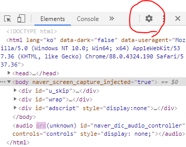 그다음, 브라우저 어디든 키보드에서 [F12]를 누르면 오른쪽 옆에 이러한 창이 뜹니다. 여기서 다른 것 보지 말고 맨 위에 보시면 톱니바퀴 모양의 환경 설정이 있어요. 이걸 눌러주세요.